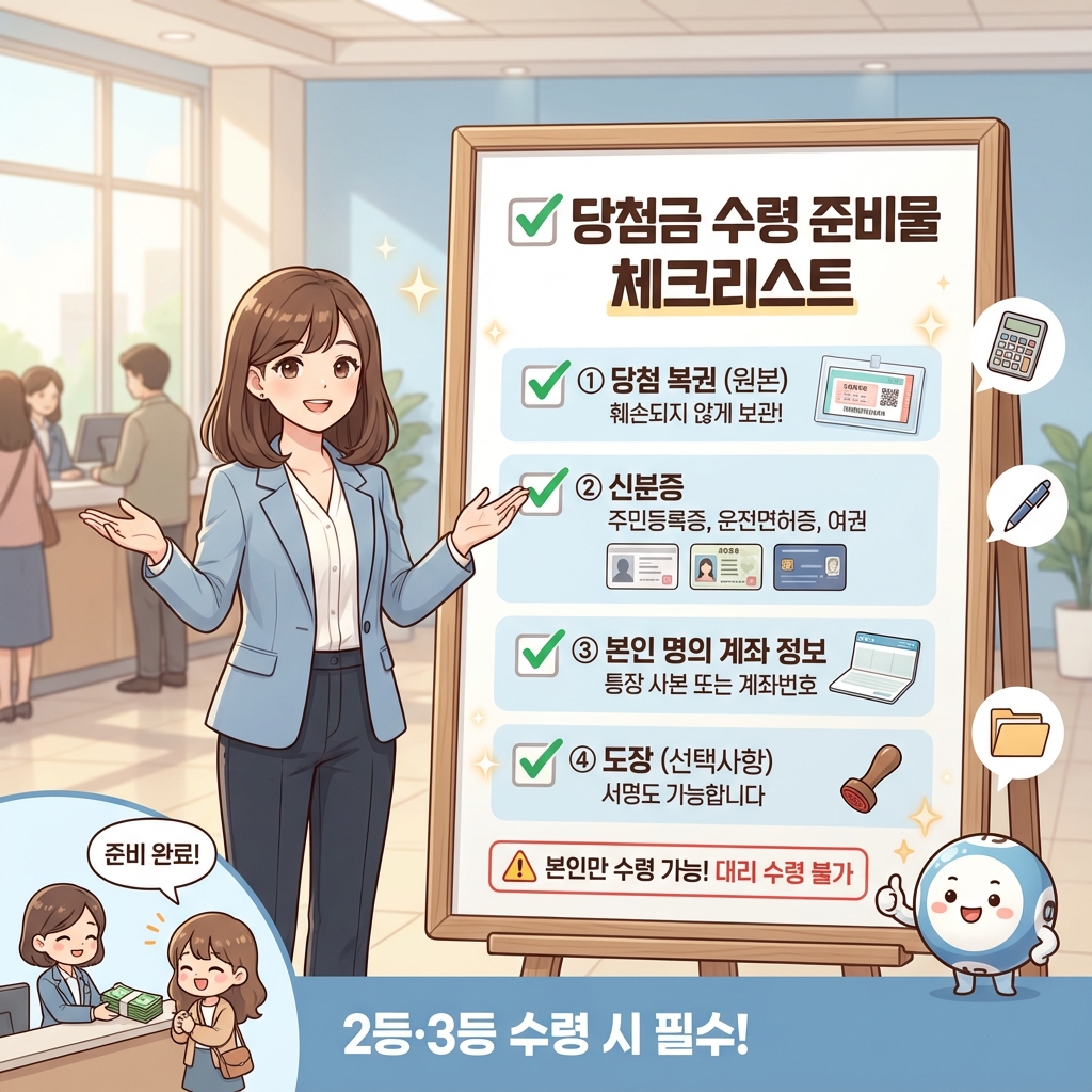 당첨금 받으러 갈 때 준비물 챙기지 않으면 진짜 난감해요. 특히 2등, 3등은 본인 확인이 철저하니까 꼭꼭 챙기세요!