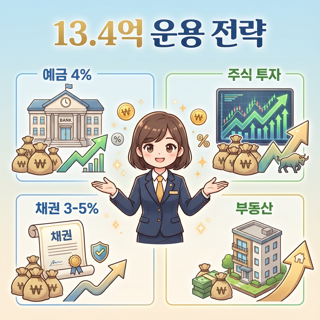 13억 4천만 원을 그냥 집에 쌓아두면 인플레이션 때문에 가치가 떨어져요. 그래서 안전하게 예금이나 투자를 해야 하는데요, 가장 현실적인 방법은 은행 정기예금이에요.