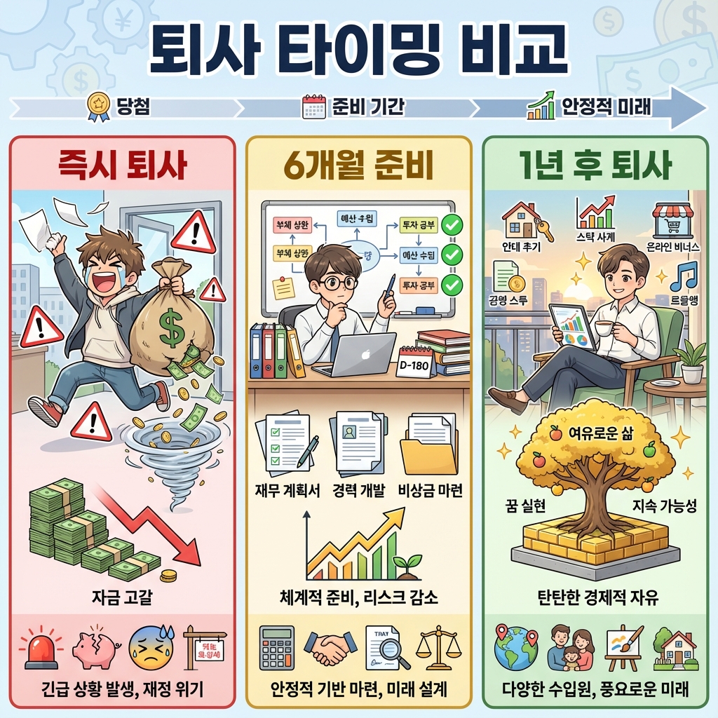 급하게 퇴사하면 나중에 후회할 수 있어요. 최소 6개월에서 1년 정도는 준비 기간을 가지는 게 좋아요. 그 기간 동안 월급은 계속 받으면서 당첨금 운용 계획을 차근차근 세우는 거죠!