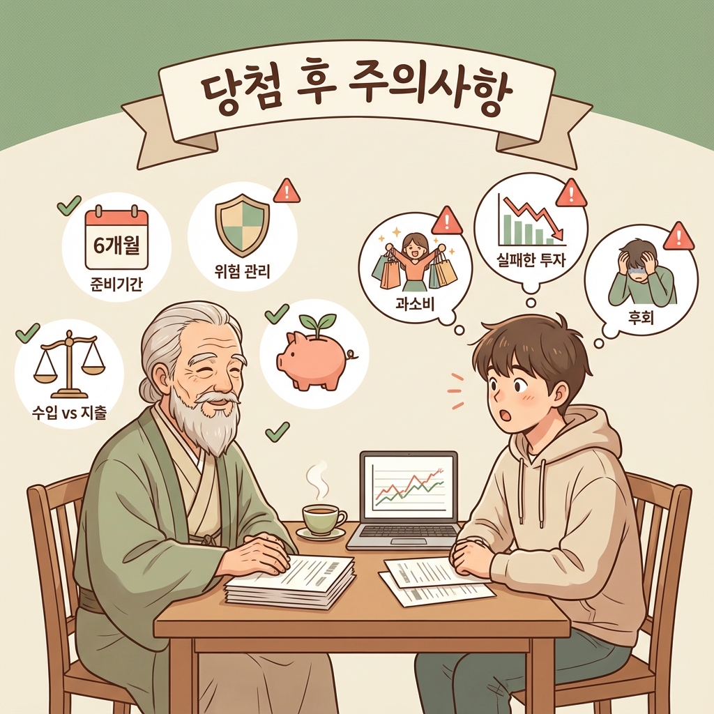 당첨 사실을 비밀로 유지하고, 전문가와 상담하며, 최소 1년은 기존 생활을 유지했다는 점이에요. 그리고 원금은 절대 건드리지 않고 이자 수입 범위 내에서만 생활했대요.
